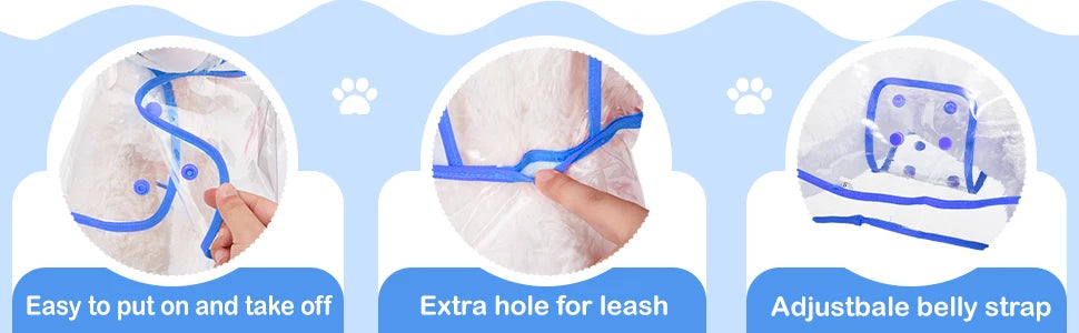 Hooded design: the pet rainwear is designed with hood, and you need to help your pet get into this outfit with the buttons on the hooded poncho, easy and convenient for pet to wear on and take off, and the hooded design can prevent your pet's head from getting wet; Belly with flaps to prevent rainwater from splashing on it.