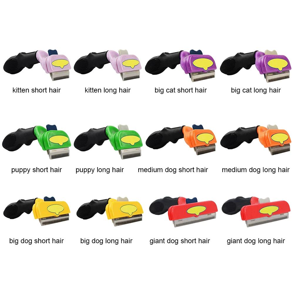 1.Efficient Detangling and Deshedding: Designed with specialized teeth, this deshedding brush effectively untangles knots in your pet's fur while effortlessly removing loose and dead hair, reducing shedding. Keep your pet's coat neat and tidy with ease. Specification: Origin: Mainland China Material: TRP Thermoplastic Rubber, ABS Plastic, Stainless Steel Blade Size: Kitten/Puppy: 15*5.5cm Medium Dog/Cat: 15*7.5cm Large Dog: 15*11cm Giant Dog: 15*13.5cm
